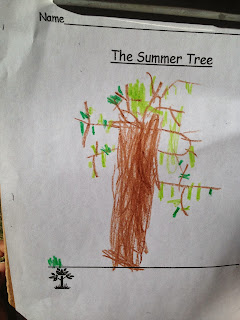 We went outside to begin our new science unit on "Trees". After learning the parts of the tree, students draw the "Summer Tree" before the leaves start to turn colors. We learned how to draw what we see, including roots, trunk, branches and leaves.